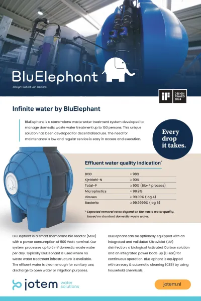 In an ideal world, there would be no waste water. In that world, polluted water from our households would form a new source of irrigation water, groundwater or rinse water. That world is brought a step closer with BluElephant. A mobile, decentralised waste water purification system that can purify the waste water up to 150 people every day.